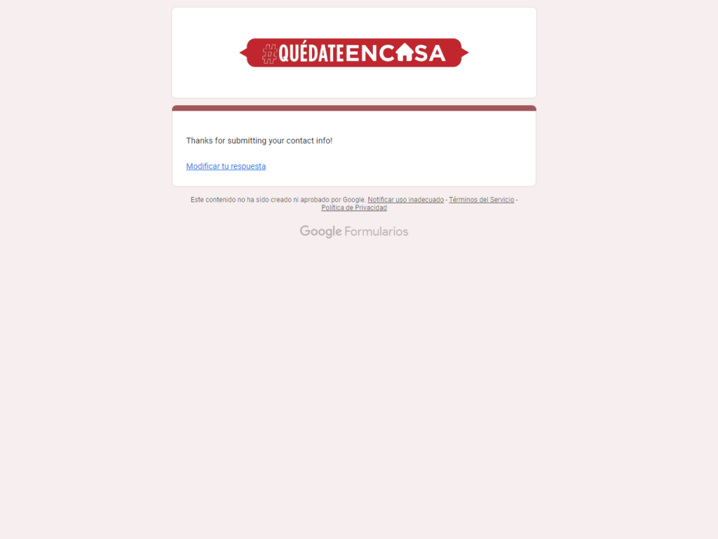 5 – Paso final, te va a salir que ya rellenaste el formulario en ingles, esto quiere decir que las personas de quedate en casa tienen tus datos de contacto, ahora debes esperar que te llamen, como ustedes saben Informe RD solo desea apoyar con contenido de valor al pueblo dominicano, si tienes alguna duda de estos pasos que le mencionados a continuación te exhortamos que antes de llenar los formularios llames por teléfono a los números antes mencionados mas arriba y validez la información que te estamos suministrando solo deseamos apoyar y que muchas familiares de nuestro país sean beneficiadas con la tarjeta solidaridad, abajo te deja la imagen de como termina el proceso.